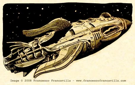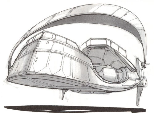 Rocket fliers are 12-15 foot torpedo-shaped craft used for both civilian and military purposes. Armed with a swivel-mounted rocket cannon, they are fighter aircraft often used to complement rocket cruisers. Unarmed they serve as flying taxis or personal vehicles. Like rocket cruisers, they can hover in place or drift with the wind without expending power because of the anti-gravity material packed into their hulls.